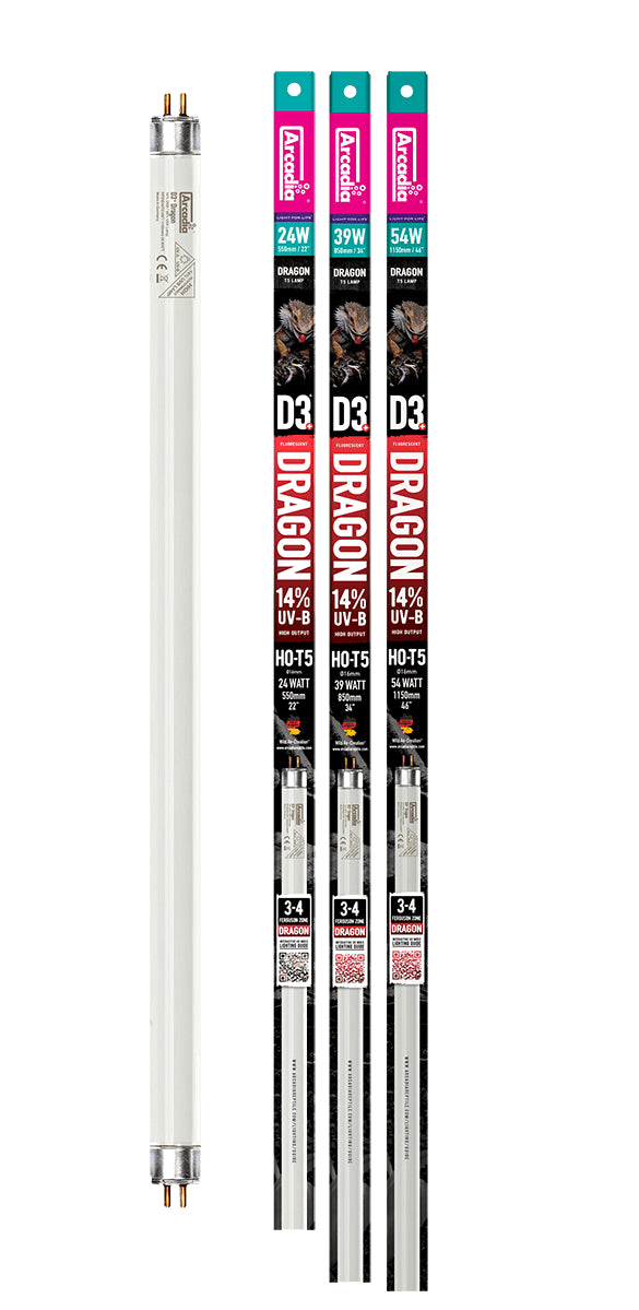 Descoperă lampa Arcadia Reptile 14% UV-B 'Dragon Lamp',  cea mai puternică lampă pentru reptile HO-T5. Cu un conținut ridicat de 14% UV-B, această lampă este perfectă pentru susținerea sintezei vitaminei D3 la speciile de reptile din deșert.